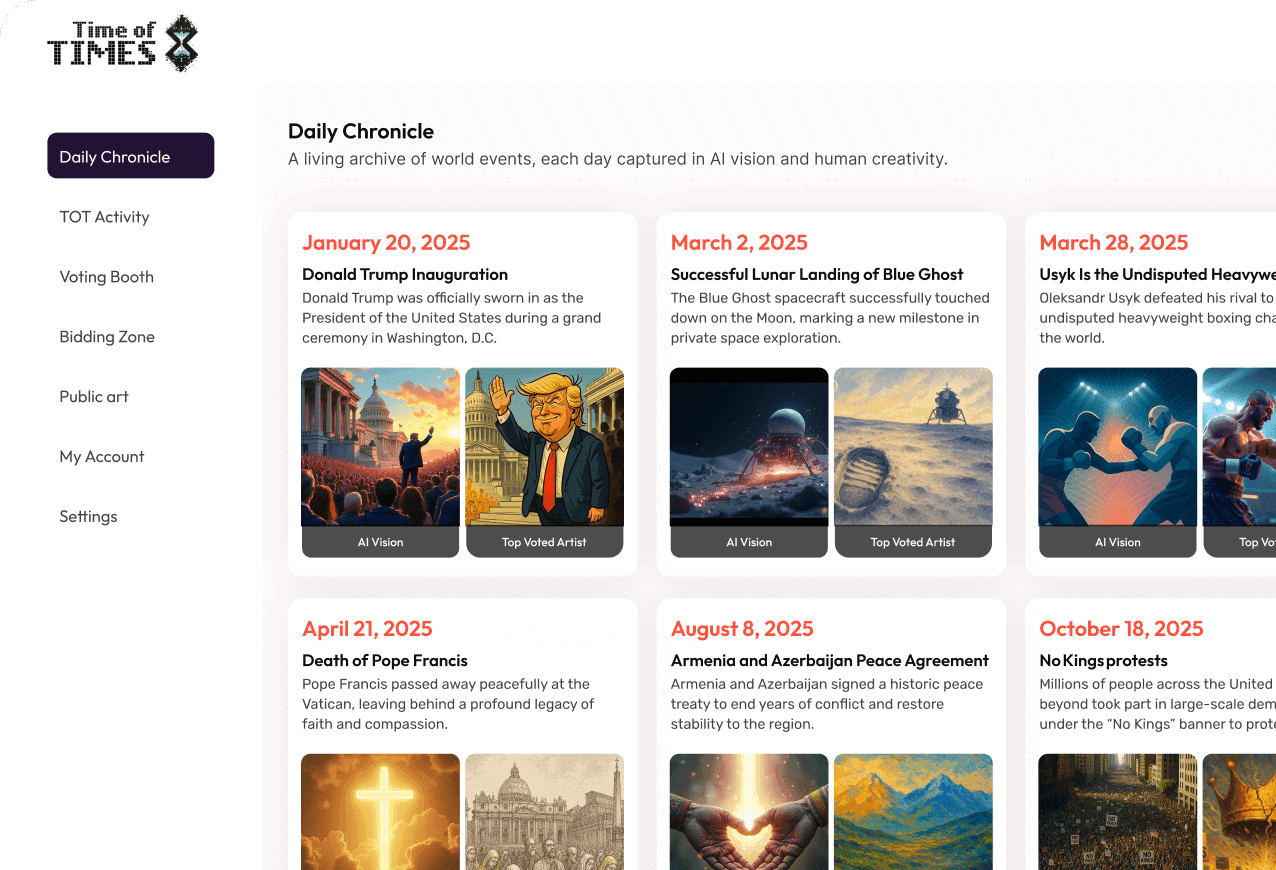 By voting with $TIMES tokens, users shape the platform's history. If your chosen artwork wins, you receive part of the auction profits. The more you engage, the more you earn.